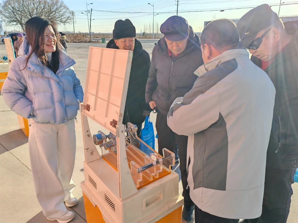 活动现场,科普大篷车化身“流动的科技馆”,天鹅绒触觉、椎体上滚等互动展品整齐陈列,迅速吸引居民驻足体验。大家争相伸手感受“天鹅绒触觉”带来的奇妙错觉,在科技辅导员的细致讲解下,弄清了皮肤触觉神经的工作原理;“椎体上滚”展品则以“逆势而上”的视觉效果颠覆认知,群众在亲手操作中理解了重心偏移的科学奥秘,现场欢呼声与咨询声不绝于耳。