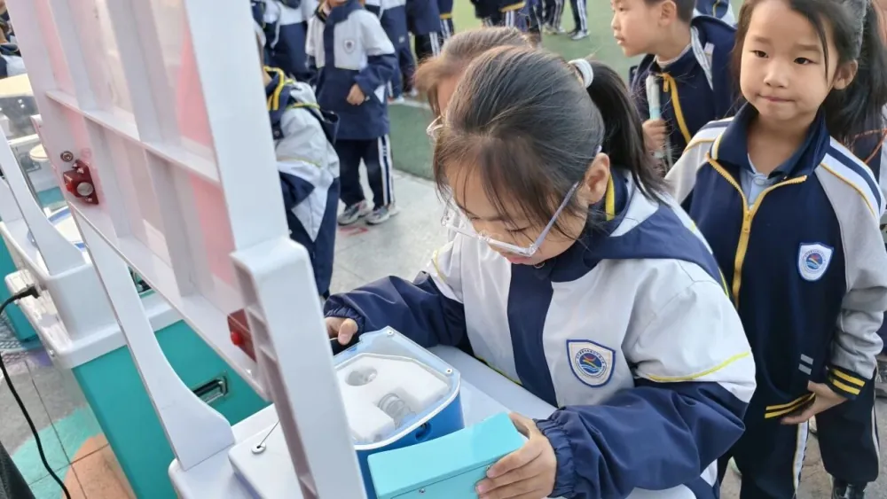 活动现场,同学们穿梭在各类展品之间,在动手实践中解锁科学奥秘。在“角反射器”前,大家争相探究光影折射产生的多重镜像;在“齿轮音乐台”旁,孩子们用力转动手柄,感受机械传动奏出的美妙旋律;而“空气粘性飞盘”的悬浮飞行与“跳动的锡箔环”的电磁感应现象,更像是一场科学“魔术”,引得围观学生惊叹连连。