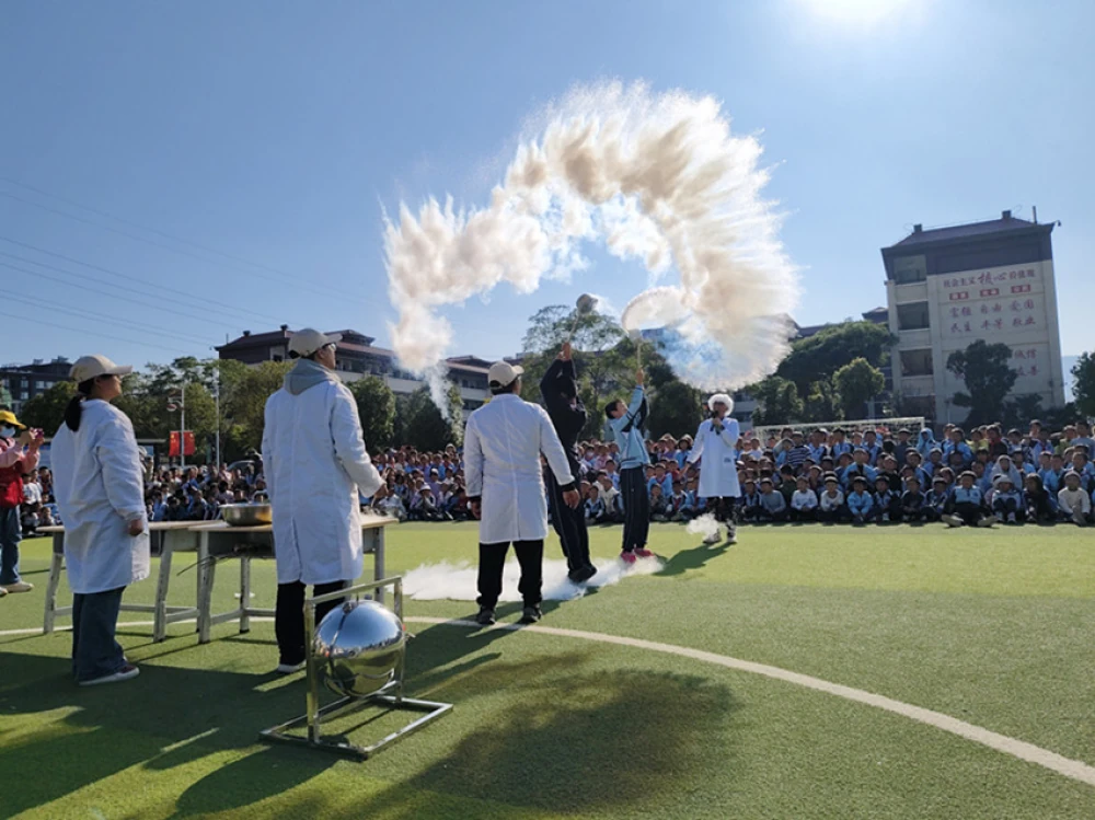 活动以沉浸式科学实验为核心,融合航天元素与基层物理化学原理,设计了“环保礼炮”“气体系列实验”“极冷液氮秀”及“水火箭发射”等互动环节。学生通过亲手操作手拉水火箭、观察液氮冻结鲜花、见证气体喷泉等现象、在震撼视觉体验中理解牛顿等三定律、气液转化、低温效应等科学概念。穿插的“火云掌”“人工降雨”等特色实验,进一步将抽象知识具象化,实现“做中学、玩中悟”。