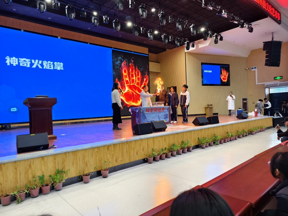 活动现场精彩纷呈,趣味科普展演率先登场。静电实验中,“怒发冲冠”的奇妙现象引得学生阵阵惊呼;马德堡半球实验直观展现大气压强的威力,让抽象的物理知识变得触手可及;“粉尘爆炸”“大象牙膏”“干冰秀”等经典科学实验依次亮相,绚烂的现象与震撼的效果,让学生沉浸式感受科学的神奇魅力.