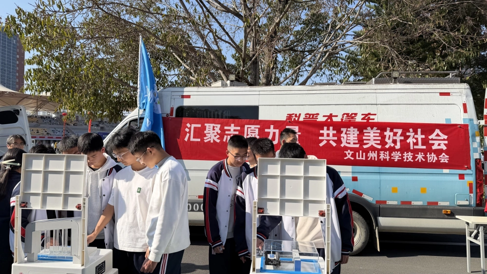文山州县(市)联动,科普进校园激发青春梦想。12月2日,活动以文山市第一中学科技节为契机拉开序幕。州科协科普工作队联合文山、砚山、马关、麻栗坡、西畴等县(市)科协,组织六辆科普大篷车开进校园,聚焦青少年科学素养提升,为5000余名师生带来了一场生动活泼的课外“科普课堂”。现场展示了涵盖声、光、电、磁、力等多学科原理的互动展具,以及智能机器狗、机器人等前沿科技展品,吸引学生踊跃参与、积极体验。活动还向学校赠送《奥秘》《公民科学素质读本》等科普读物1300余册,进一步丰富了校园科普资源,在青少年心中深植科学探索的种子。