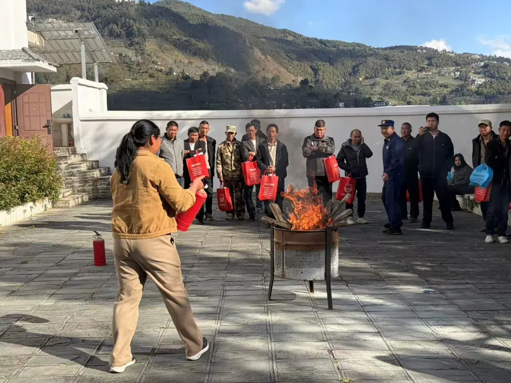 在消防模块的培训中,南涧县消防救援大队的队员们率先开展火灭火器实操环节,消防队员在室外设置模拟火盆,手把手教学“提、拔、握、压”的操作要领,参训人员轮流上阵,亲手扑灭明火,将理论知识转化为实操能力。针对农村消防安全痛点,队员们还重点讲解了柴草堆放、灶台用火、冬季烤火取暖等常见防火知识,结合无量山镇山地多、村落分散的特点,强调山林火灾预警与初期处置的关键步骤。