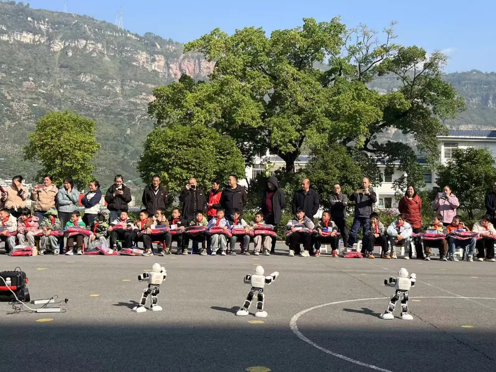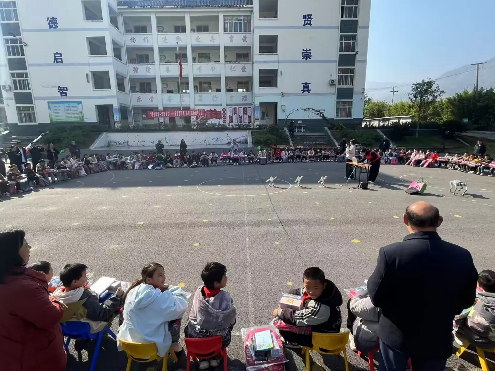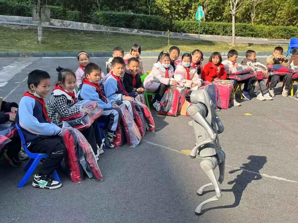 拿到物资后,学生代表上台发言,用稚嫩的声音表达着对永善县群团“联盟”以及爱心企业的感激之情。除了暖心物资,永善县科协工作人员还同步开展了科普宣传活动,同学们在操场上整齐围坐成一圈,一只机器狗迈着稳健的步伐绕场而行,不时抬起前爪“挥手”互动,憨态可掬的模样引来阵阵欢笑。