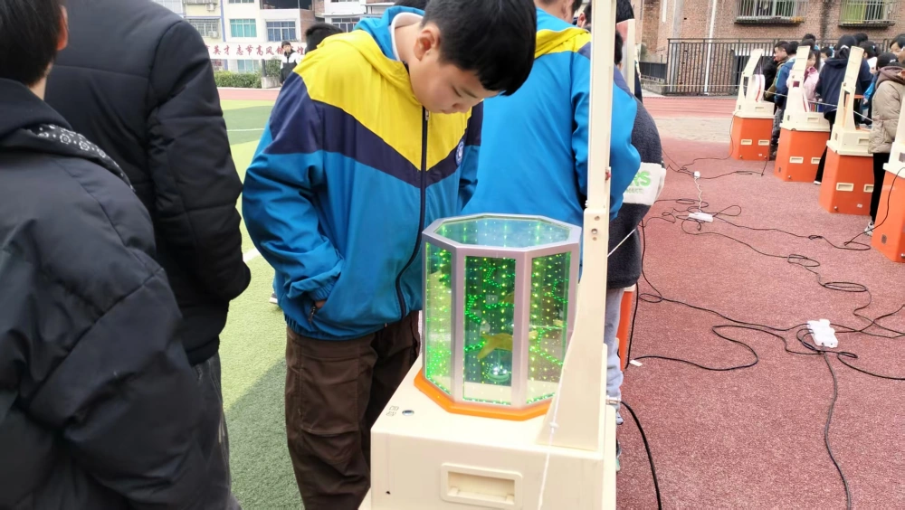 活动现场,20多件科普展品将科学性与趣味性完美融合,学生们动手操作,便能见证奇妙的科学现象,领悟背后的科学原理。学生们踊跃参与互动体验,现场气氛热烈非凡。无弦琴无需琴弦借红外感应实现隔空弹奏,让学生直观感受声学奥秘;食品安全展品通过图文讲解与互动问答,普及饮食健康知识,助力学生养成良好饮食习惯;银蛋在电磁感应作用下自动竖立旋转,揭秘电动机的工作原理;“汽车变速箱”拆解机械结构,展现工程技术的精妙;简易模型直观呈现离心力的日常应用,让抽象理论具象化;科学实验秀同样亮点纷呈,火焰掌、离心力、焰色反应轮番登场,奇妙现象直观鲜活。