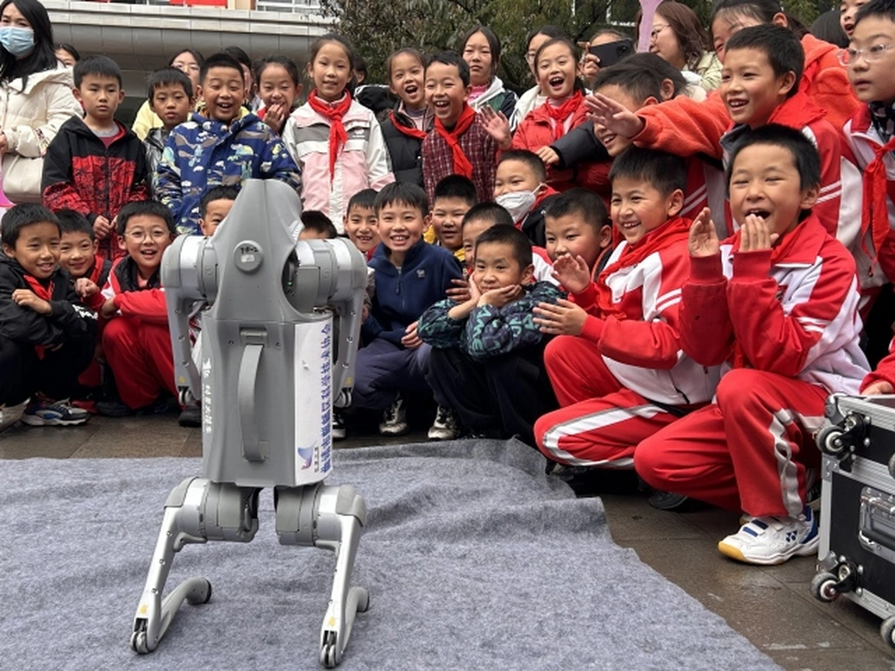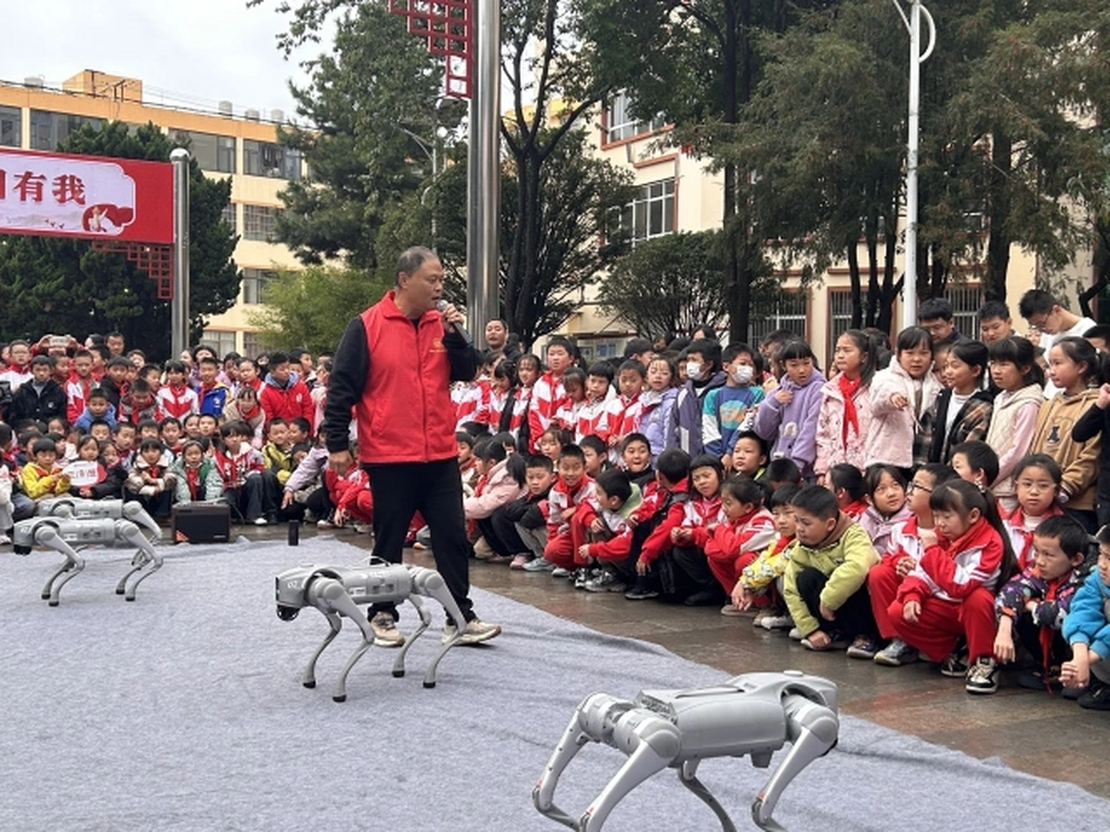 科普大篷车团队带来了学生们最期待的“明星嘉宾”——智能机器狗吸引了全场目光,随着指令下达,多只机器狗灵活完成各项动作,还能跟着音乐跳起舞蹈,憨态可掬又充满科技感的表现,让学生们欢呼不断,纷纷把机器狗围起来观看,工作人员耐心解答的同时,还邀请学生们上手操作平板,控制机器狗,现场互动氛围热烈又轻松。