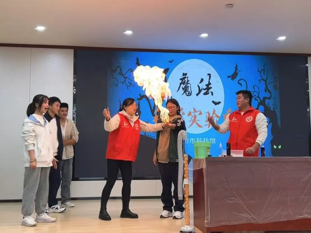 晚上“魔法科学实验秀”和科普情景剧在报告厅拉开帷幕,科普志愿者们完美演绎赢得阵阵掌声,学生们在观看精彩实验和情景剧的同时,也学习到了各种科学知识。