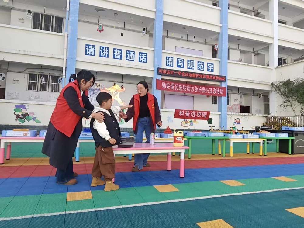 活动中,县红十字会志愿者化身“急救小老师”,用通俗易懂的语言讲解徒手心肺复苏操作要领,借助模拟人演示胸外按压、人工呼吸标准动作,邀请老师和小朋友近距离观摩学习,帮助大家了解实用急救技能。师宗现代医院医护团队则贴心开展健康义诊服务,口腔科、五官科、眼科、外科医生分别为小朋友检查牙齿、外耳道、视力及皮肤四肢发育情况,普及护牙、耳部清洁、护眼等健康知识,提供专业健康建议。
