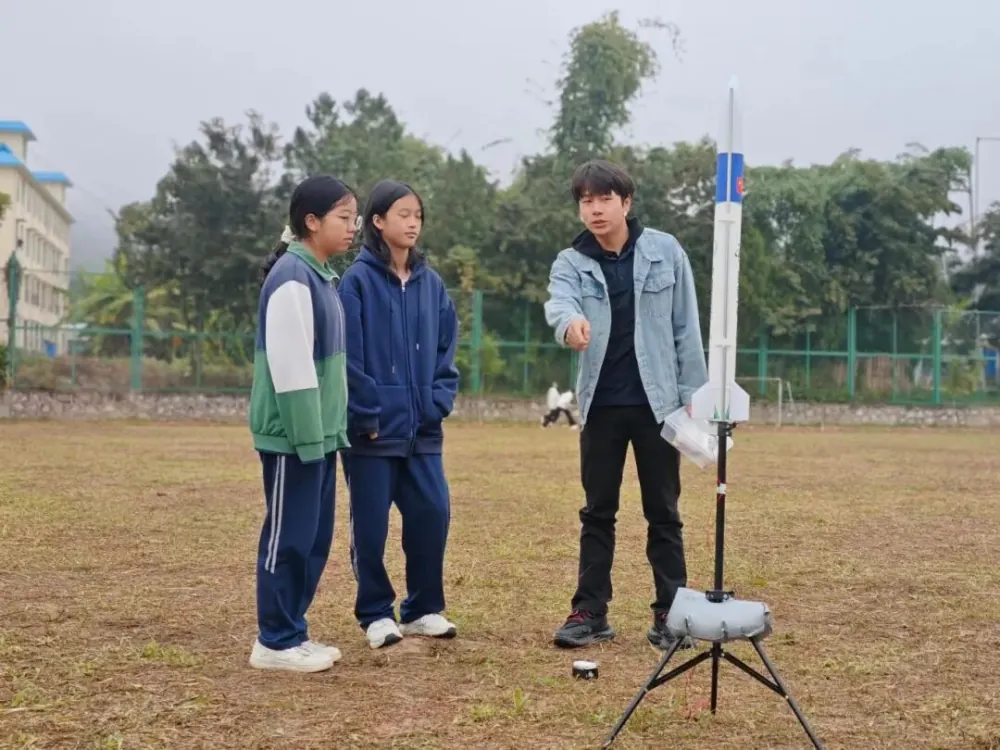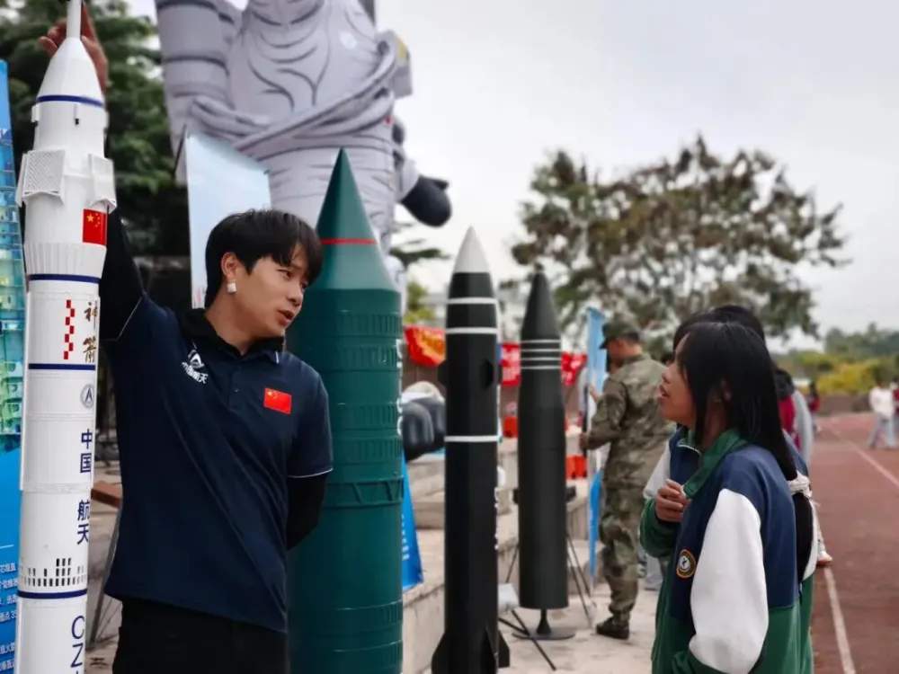 活动现场设置了火箭发射演示、机器狗互动、导弹模型展示、3D打印机实操等多个趣味科普项目,以沉浸式体验替代传统桌面智力游戏,让学生在运动氛围中感受科技魅力。 科普展示项目深受学生喜爱,大家纷纷围拢在各个展示区,或屏息观看火箭发射的震撼瞬间,或好奇观察机器狗的灵活动作,或近距离探究导弹模型的细节构造,或驻足围观3D打印机“化虚为实”的奇妙过程。