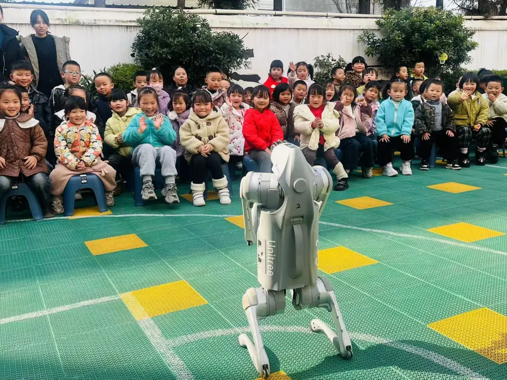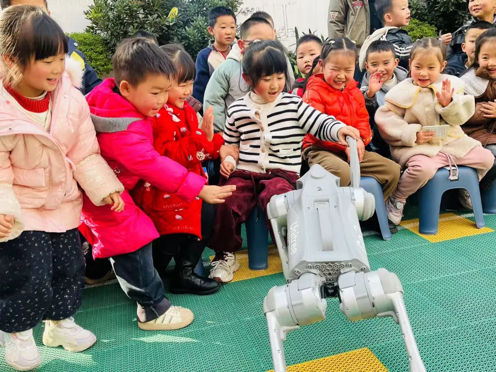 活动伊始,刚结束午睡的孩子们,在老师的引导下有序来到活动场地。尽管还带着些许睡意,但精彩的科学表演很快点燃了大家的热情。现场,机器狗率先登场,它灵活响应指令,完成行走、转圈等一系列动作,还在工作人员的引导下主动伸出“前爪”,与前排小朋友握手互动,童趣满满的画面引得现场笑声、掌声此起彼伏。