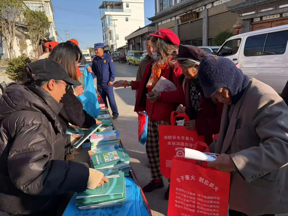 洱源县消防救援大队的消防员们成了现场的“科普主角”,他们摆开展台,拿出灭火器、防火面罩、家庭火灾逃生模型等器材,手把手教村民使用灭火器的正确步骤,讲解家庭火灾中如何快速逃生、如何排查用电用火隐患。一位大娘看着消防员演示灭火器操作,忍不住上前尝试,消防员耐心纠正她的动作,还叮嘱道:“家里的电器老化了要及时换,柴火别堆在灶台旁。”针对农村冬季用火频繁的特点,消防员还重点讲解了柴草堆放、炭火取暖的防火要点,发放了印有防火标语的环保袋、宣传手册,让消防安全知识看得见、带得走。