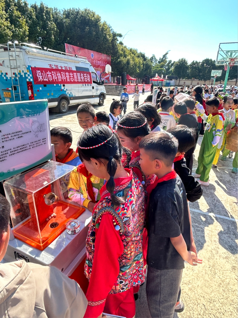 针对山区学校的特点,此次科普活动精心设计了展示内容。不仅有趣味实验揭示基础科学,如“静电乒乓”,更有与生活贴近的科普展示。孩子们穿着鲜艳的民族服饰与整齐的校服,或头戴VR设备沉浸体验,或围绕展品低头钻研,或排队领取印有科普标语的帆布袋,脸上洋溢着对新知纯粹的好奇与渴望。操场上,科普大篷车“践行核心价值观 共筑伟大中国梦”的横幅,与孩子们专注的身影、葱郁的树木、湛蓝的天空,构成一幅充满希望的画面。