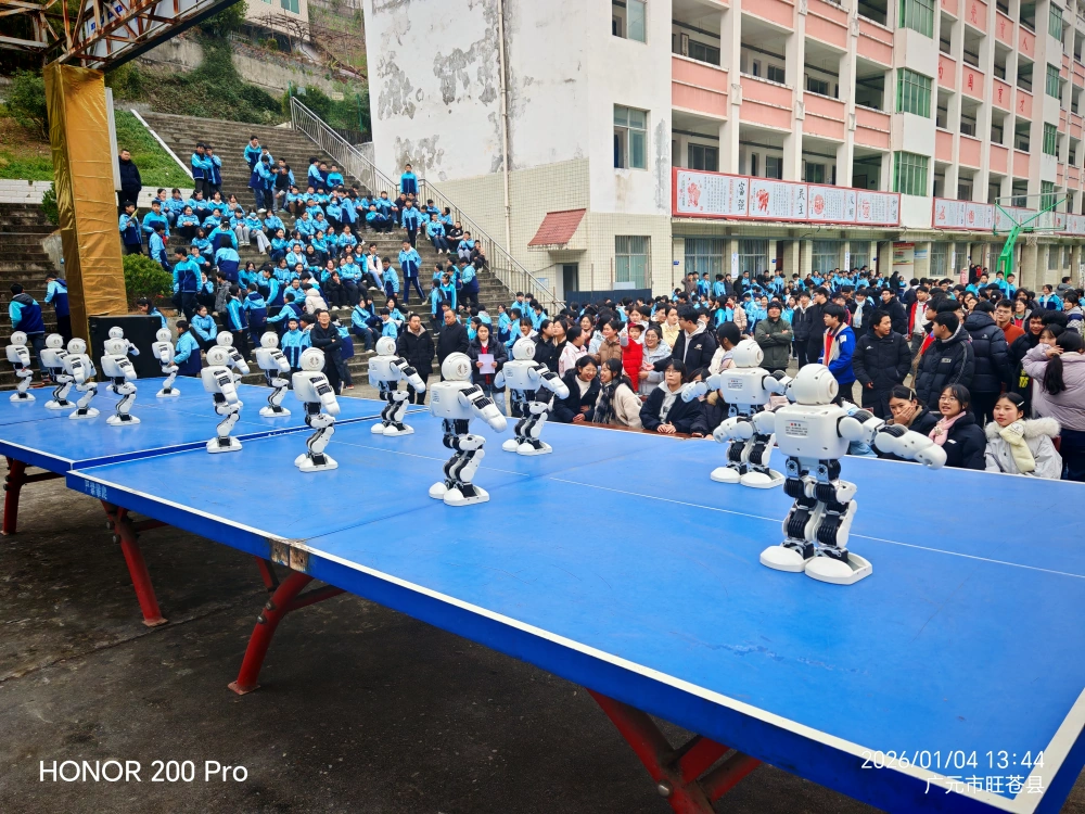 2026年1月4日,国华中学校园科技节迎来重磅活动—旺苍县科协科普大篷车携15台智能机器人惊艳亮相。在操场中央的科技展演区,机器人方阵先后呈现《未来之舞》《科技中国风》等创意节目,其中双足机器人完成高难度后空翻动作时,引发全场500余名师生热烈掌声。