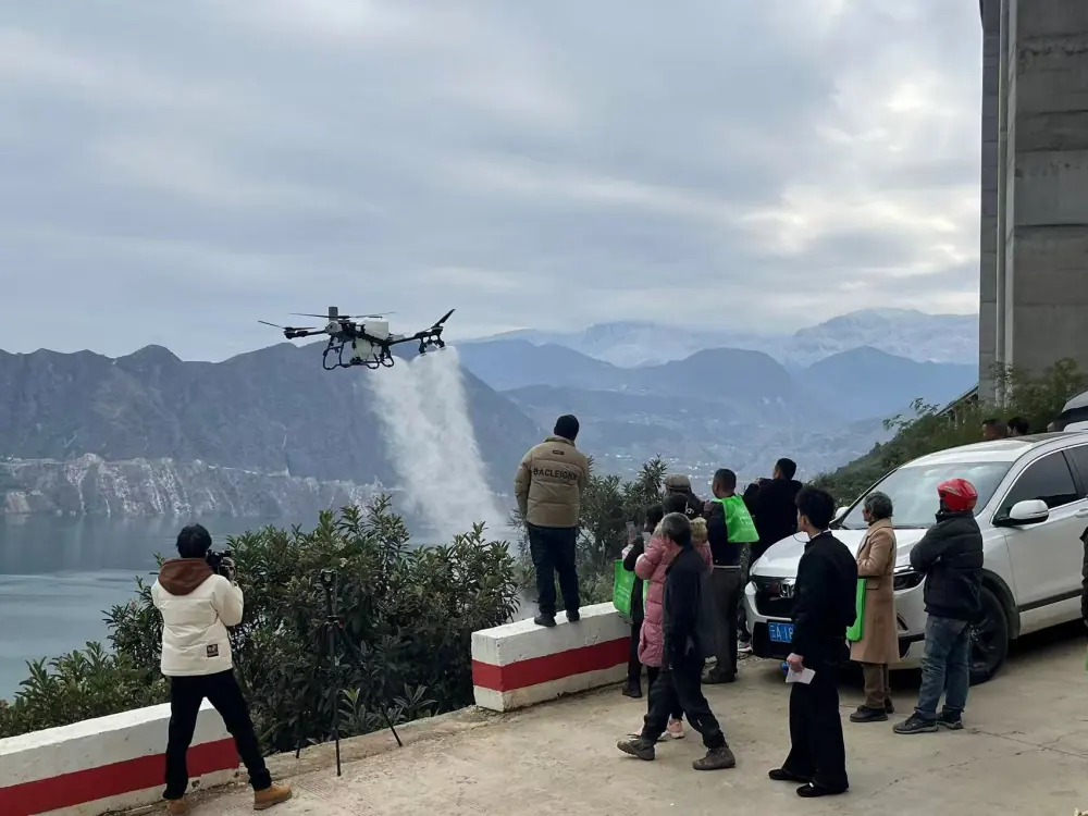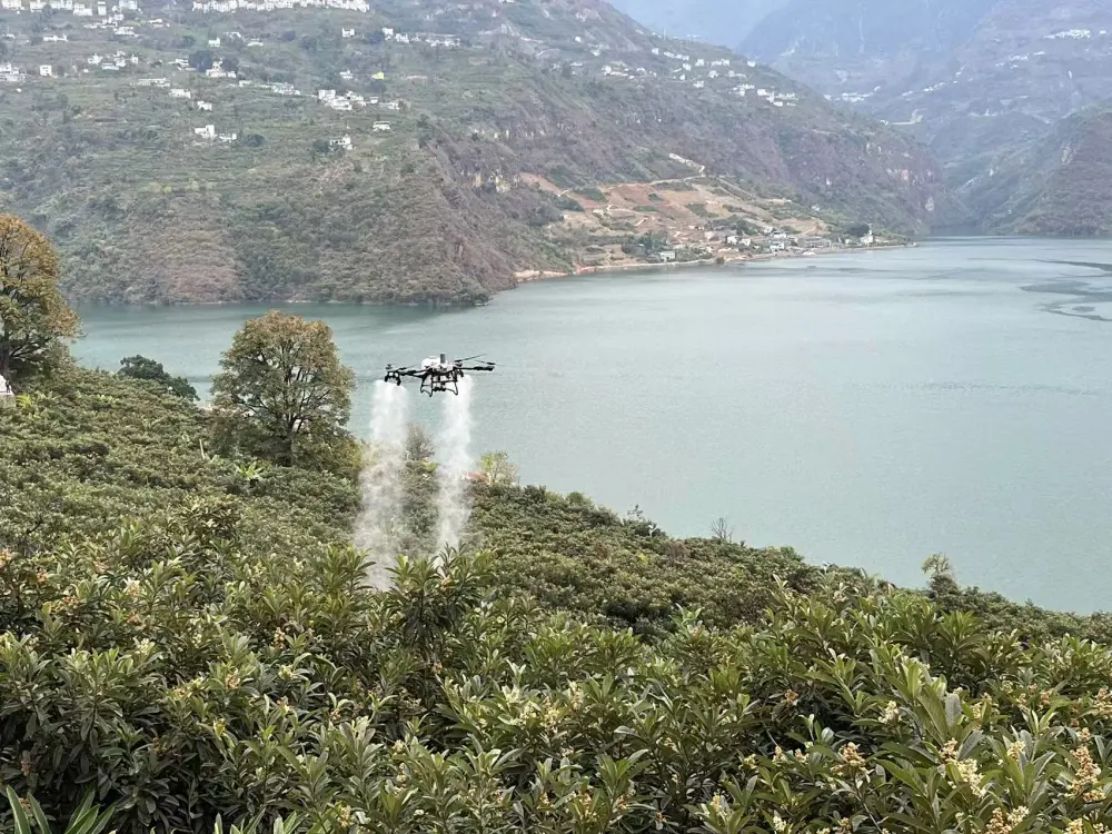 培训现场还开展了无人机飞防演示,工作人员操作无人机在枇杷园上空平稳飞行,均匀喷洒水雾,直观展示其在病虫害防治、果实吊运等场景的应用优势,增强群众科技兴农意识。