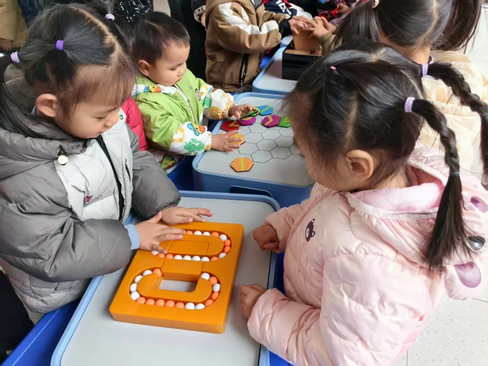 益智游戏种类丰富,操作材料有趣。小朋友们专注地操作着,对操作材料爱不释手,玩得不亦乐乎。