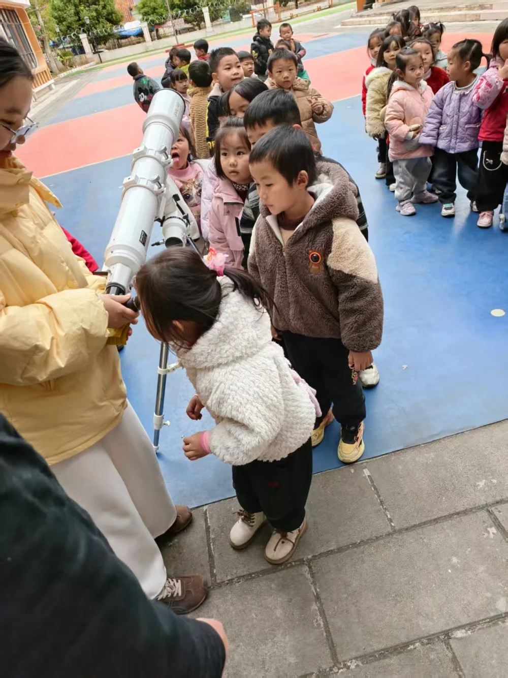 天文望远镜不只是晚上看星星的工具!今天在幼儿园,小朋友们用它观察远处的景物,亲手体验调整镜筒,发现“超级大眼睛”在白天的奇妙用处。