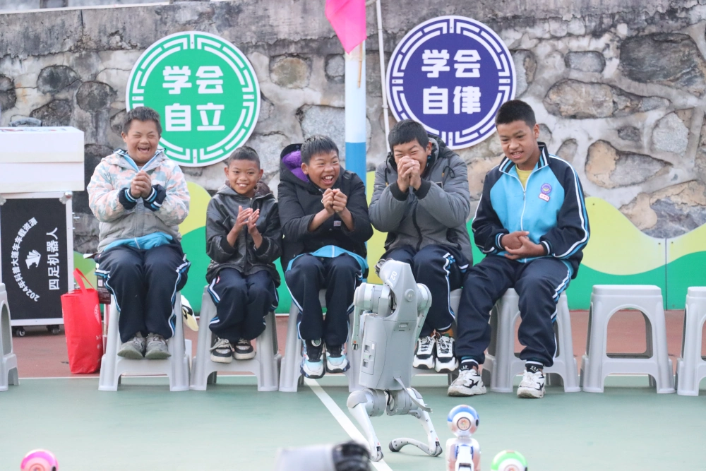 你动我来猜”环节让现场充满笑声。孩子们用肢体语言描绘科学现象,机器狗做出行走、翻滚、作揖等动作给孩子们猜,每一次成功的猜对都带来全场的欢呼。这个游戏让孩子们在玩中学,在欢乐中了解科学。孩子们与机器狗互相拜年,稚嫩的祝福声和机器的俏皮回应交织在一起。