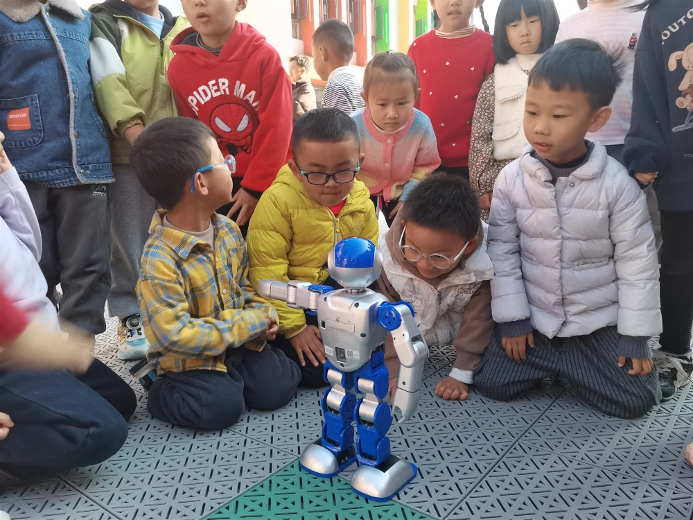 知识讲堂结束后,互动体验环节精彩开启。孩子们化身“小小工程师”,手持控制器轮流指挥机器狗完成交叉步、比心、倒立等指令,精准的动作执行引得现场掌声、笑声不断。跳舞机器人的惊喜登场,更让孩子们兴奋不已,纷纷围上前与科技感满满的机器人同框互动、跟随起舞。15组涵盖几何拼图、逻辑推理等模块的益智教具,成为孩子们协作闯关的“乐园”,在老师和科普工作人员的帮助下,大家齐心协力破解难题,尽情享受动手探索的乐趣。10组科普展板以“有魔力的水”“保险丝的舍己为人”等趣味主题,在老师的耐心讲解下,让孩子们初步感知科学常识的奇妙。