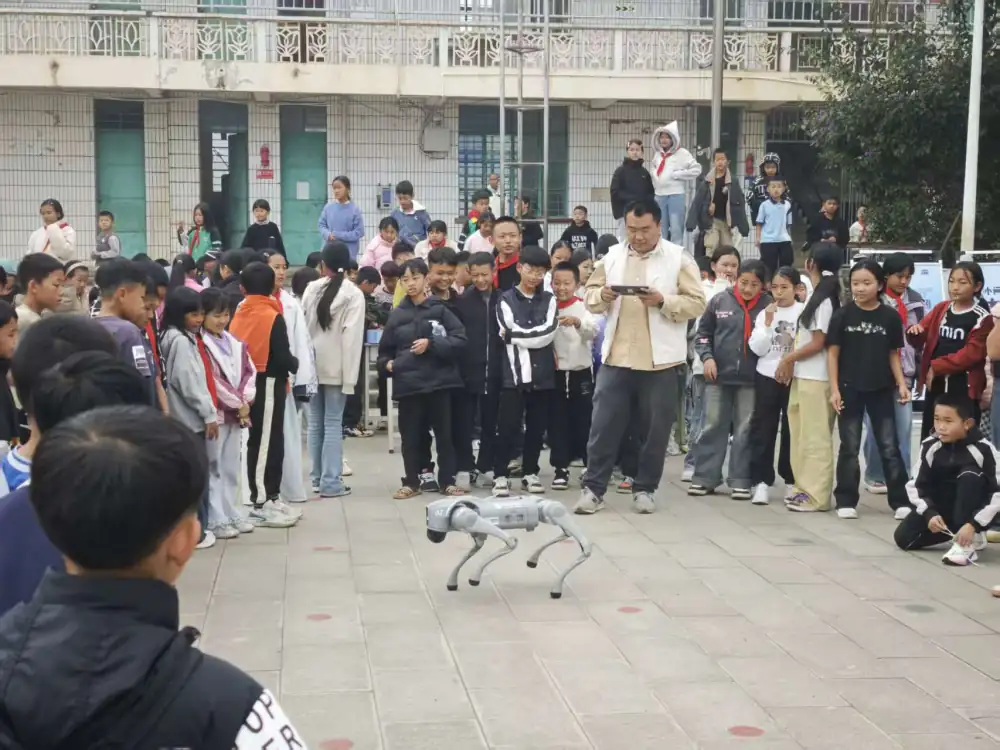 “快看!机器狗会跳舞!”随着学生们的惊呼,机器狗互动环节将现场气氛推向高潮。在工作人员的操控下,灵动的机器狗流畅完成行走、转弯、跳跃等动作,还能跟随指令做出握手、转圈等互动姿态,萌态十足的表现瞬间俘获了孩子们的心。大家纷纷围拢过来,有的踮起脚尖仔细观察,有的勇敢地伸出小手与机器狗互动,还不断抛出“它为什么会听话?”“里面有芯片吗?”等充满好奇的问题,工作人员用通俗易懂的语言逐一解答,并拆解机器狗的关节结构,讲解伺服电机与陀螺仪的协同工作原理,让孩子们直观感受人工智能与机械工程的融合魅力。