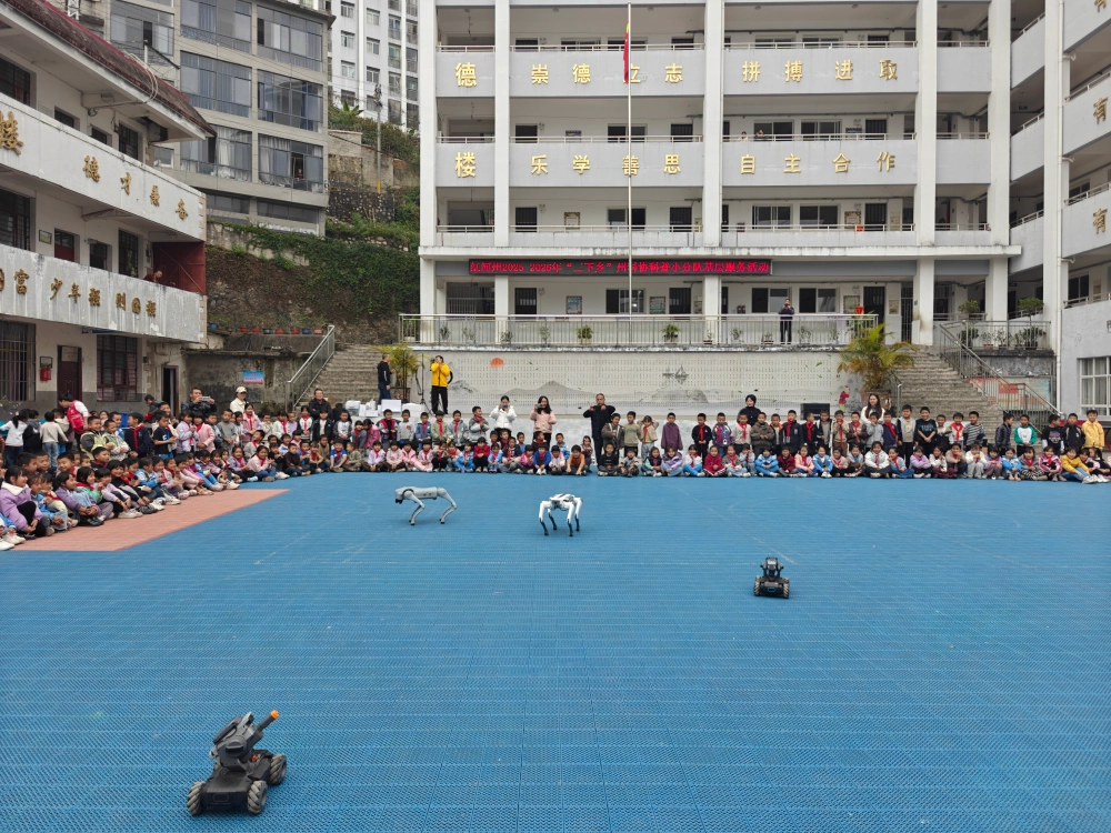 活动现场,科普志愿者为一千余名师生带来了科技感十足的编队无人机、机器人表演,演示并邀请学生参与“空气炮”科普小实验,发放防灾减灾、民族团结进步等科普宣传读本,引导学生体验VR眼镜、机器狗、科学益智小游戏等互动器材。同学们热情参与、激动欢呼,现场汇成一片科技与欢乐交织的海洋。