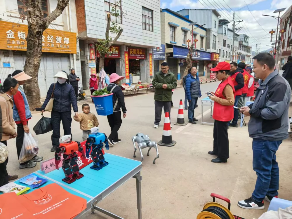 活动现场,赶集群众在县中彝医院义诊服务台前排起了长队,等待专业技术人员给予科学的健康生活指导;县民协龙街文艺队带来的山歌、民族舞蹈迎来了现场观众的阵阵掌声;县书法家协会科普志愿服务队书写的新春对联更是成了群众争抢的香饽饽;在县科协机器狗、机器人展示区,过往群众看着机器人在固定轨道上走迷宫、唱歌、跳舞、拳击;机器人给过往群众鞠躬、拜年、比心,和群众握手,群众们驻足不前……欢呼声与惊叹声交织在一起,那是群众对科技的热爱。