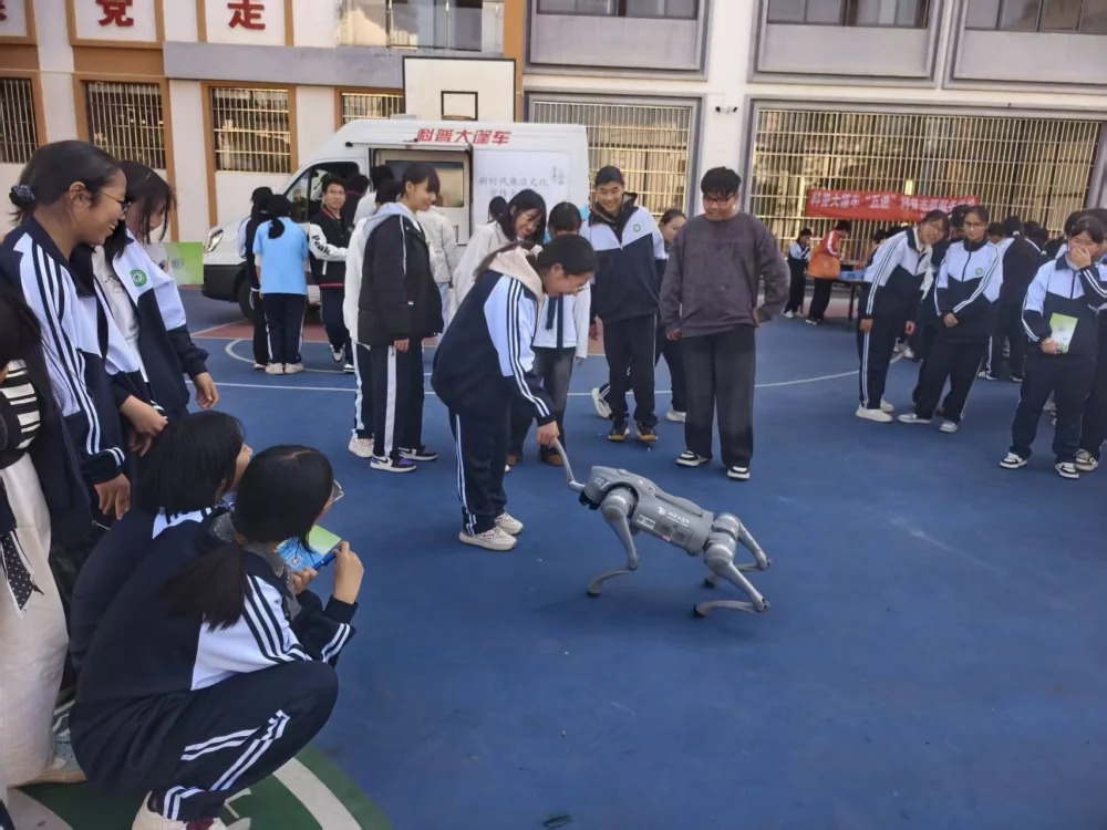 此次活动以互动体验与知识普及相结合,形式新颖,内容丰富。在前沿科技体验区,四足机器人、无人机和VR眼镜等科技设备悉数亮相。学生们在志愿者的指导下,亲手操控设备,感受人工智能与机器人技术的魅力,惊叹声与欢笑声此起彼伏。“以前只在电视上看到过这种机器人,没想到今天能自己操纵,太酷了!”一位亲手体验了四足机器人的同学兴奋地说道。这种零距离、沉浸式的互动,极大地激发了同学们“讲科学、爱科学、学科学、用科学”的内在动力。