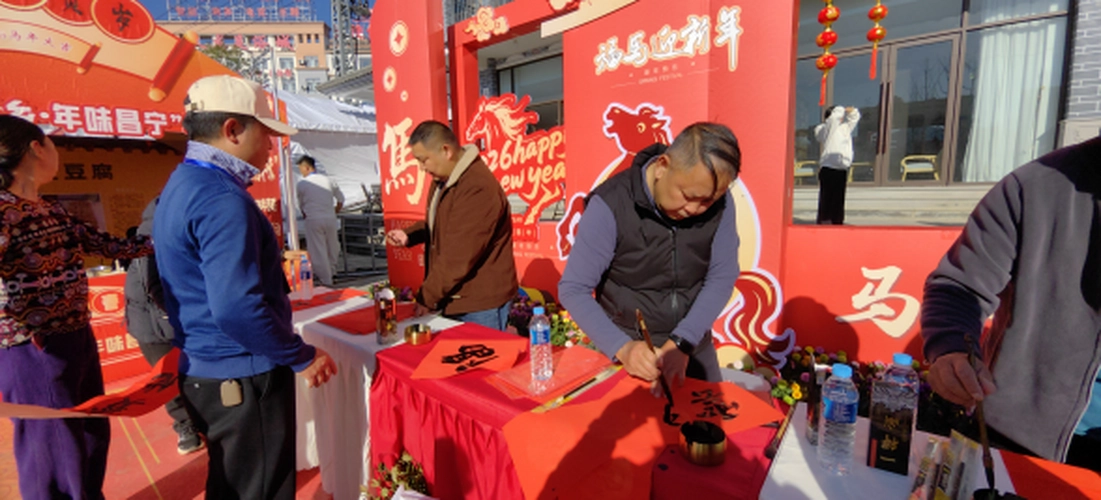 春联摊位前红火喜庆,县文联的书法爱好者们挥毫泼墨,笔走龙蛇。一幅幅寓意美好的春联、一个个苍劲有力的“福”字相继呈现。“春满人间福满堂,福降神州喜临门”“平安喜乐常相伴,健康顺遂永相随”……字里行间洋溢着对新年的美好期盼,市民们纷纷挑选心仪的春联,脸上绽放出喜悦的笑容。