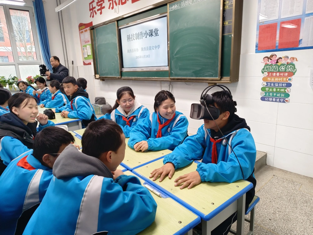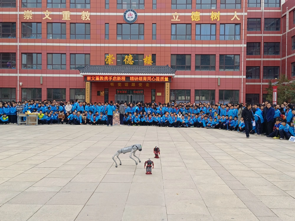 活动现场,首先向同学们展示了“科学家精神进校园”及反邪教警示宣传教育科普展板,工作人员生动地宣讲了科学家的事迹、精神以及邪教的本质、特点。互动体验区,机器人和机器狗的精彩表演将活动推向高潮,机器狗的奔跑、跳跃、打滚等一系列动作,让同学们直观感受到人工智能的神奇魅力,同学们纷纷凑上前和机器狗进行互动;机器人的军训表演、成语接龙、舞蹈表演……使同学们的掌声此起彼伏;孩子们争先恐后的戴上VR 眼镜,亲身感受虚拟世界的无限魅力,精彩奇妙的科普之旅激发了孩子们对科学的好奇与探索。在七年级二班开展了科技制作小课堂,县科协工作人员为孩子们发放了科技手工制作模型,讲解了每个制作模型的工作原理,并让大家熟悉制作的步骤。不一会功夫,一个个小汽车、液压装载机、拱桥……制作完成了,孩子们的脸上流露出成功的喜悦。