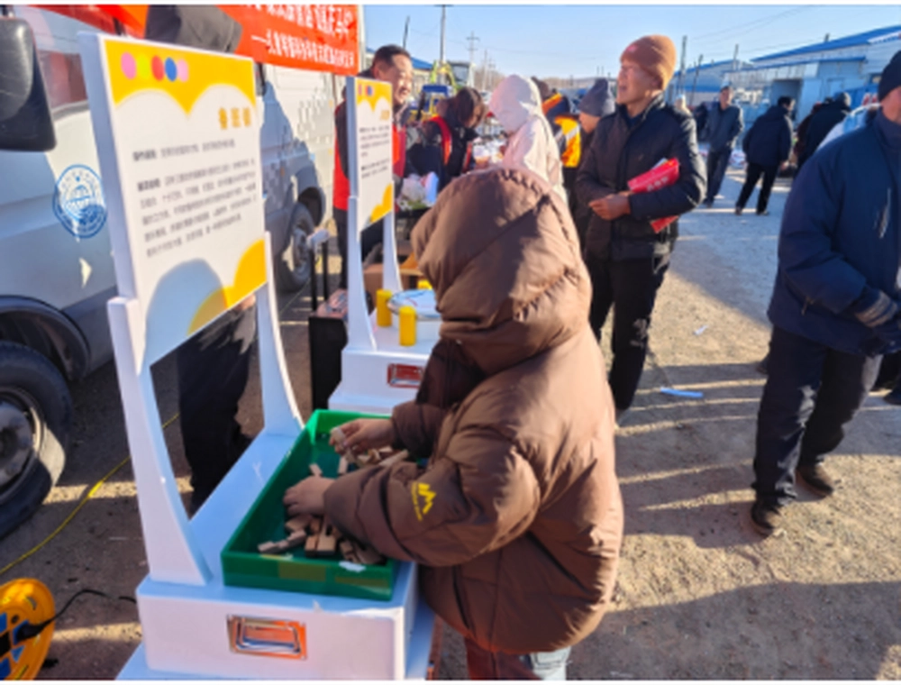 这里有个传统年味正浓的农贸大集,人流密集度很高。志愿者们一到场,便不顾天气的寒冷和环境的苛刻,迅速搭建起宣传所需要的平台。在科普大篷车搭载互动展品体验区,人体导电、鲁班锁、VR虚拟体验等设备一下就吸引了很多小朋友及感兴趣的村民,大家好奇的亲自动手操作、认真的听志愿者讲原理。科普宣传台同步开展服务,从乡村种养殖技术到《民族团结进步条例解读》等图书资料整齐陈列,印有“科普中国”二维码的围裙、纸抽等宣传品被陆续领取。党员志愿者穿梭其间,简短高效的解答大棚种植、畜禽养殖等技术问题,宣讲民族团结政策,将科学知识与团结理念同步传递。马年主题有奖科普答题区更添趣味,村民在互动中学习还间接的学习到不少安全知识。