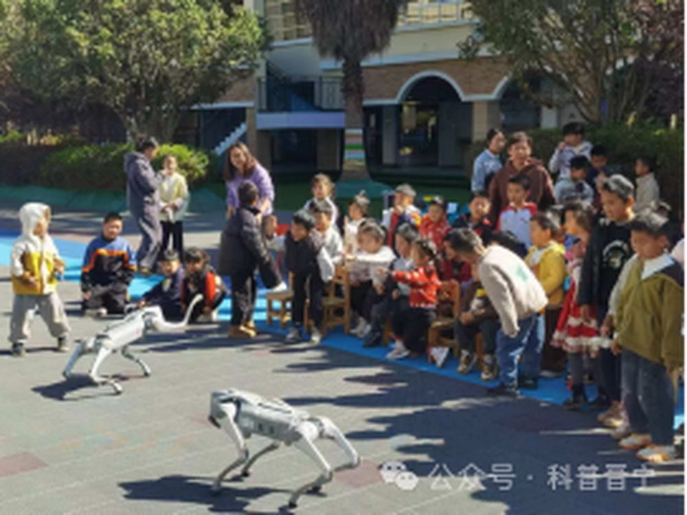 本次活动的核心环节是互动式科普体验。区科协的科普志愿者为孩子们展示了机器狗及数智玩具,孩子们目不转睛,时而发出惊叹,时而踊跃举手提问,在欢声笑语中感受到了科学的无穷魅力。