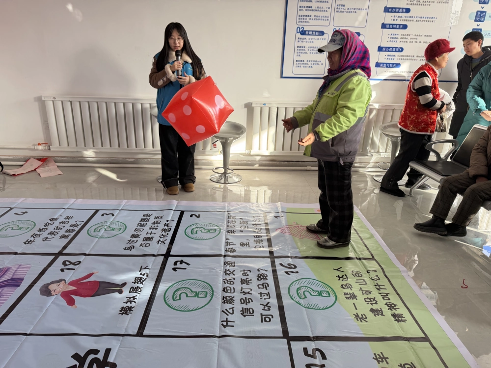 活动包含写春联、节目表演、“大富翁”游戏和健康义诊环节。结合“三下乡”主题,以经典大富翁玩法为基础,从起点出发,依次串联知识问答、互动体验和幸运奖励环节。聚焦新春佳节、传统民俗、文明素养、安全出行等核心内容设置问题,如“春节‘辞旧迎新’里‘迎新’迎接的是什么?”“乌达黄河泥塑是否属于非物质文化遗产?”“老一辈乌达人建设矿山的精神叫什么?”等问题,引导群众深入了解本土文化与传统民俗;“遛狗时必须给狗狗戴什么?”“自行车、电动车在哪条车道上行驶?”等问题,则针对性普及文明行为规范和交通安全知识。互动体验节点设置“左右肩膀各拍5下”“模拟展翅5下”等轻松趣味的动作任务,在缓解参与疲劳的同时增强活动趣味性,为完成任务的参与者发放科普手册、宣传品等,激发群众参与热情。