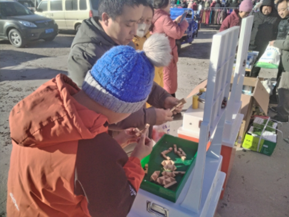 科普大篷车带来的VR虚拟体验展品、人体发声展品和鲁班锁设备,更是成了集市上的“热门打卡点”。孩子们排着小长队,迫不及待地戴上VR设备,沉浸式探索科技奥秘,不时发出好奇的惊呼;大爷大妈们围在一起,跟着志愿者手把手摆弄鲁班锁,相互讨教拆解与拼接的技巧,在动手动脑间,真切感受传统榫卯工艺的精妙与古人的智慧,同时还饶有兴致地操作人体发声展品,好奇地探寻声音产生的原理,脸上满是孩童般的新奇与欢喜。大家你一言、我一语,相互交流体验心得,欢声笑语萦绕耳畔,不知不觉就把科普知识记在了心里。