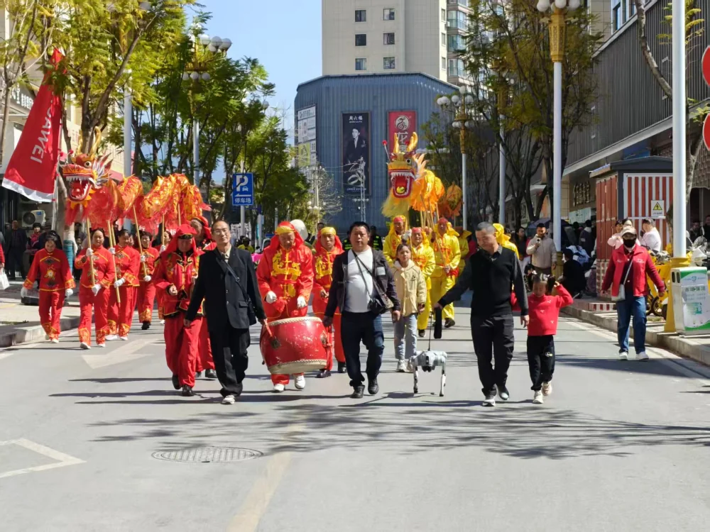 大年初一中午1点,随着铿锵的锣鼓声响起,舞龙和机器狗表演从城市港湾正式启程。大姚县科协的2只机器狗在前面引路,边走边向过往群众作揖拜年、比心、握手,成为观众争相围观的互动焦点;一黄、一红两条巨龙在机器狗后面腾空而起,龙首高昂、龙身翻卷,瞬间点燃现场气氛。巡游队伍沿东街、十字街一路前行,最终抵达核桃文化产业园。