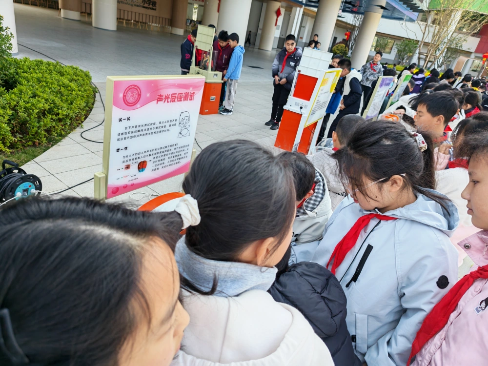 除了静态的科普展品,动态的科技展示更是将现场气氛推向了高潮。一只灵活可爱的机器狗在操场上闪亮登场,它时而前进后退,时而恭喜、时而拜年,甚至还能与同学们进行简单的互动,引得孩子们阵阵欢呼,纷纷伸出小手想要和这个"新朋友"打个招呼。紧接着,10个造型可爱的跳舞机器人伴随着动感的音乐,整齐划一地舞动起来,它们酷炫的舞姿和精准的动作赢得了全场师生的热烈掌声。与此同时,10架无人机在操场上整齐列队,变换着不同的队形,引得同学们仰望天空,发出阵阵惊叹,对飞行的奥秘充满了无限向往。