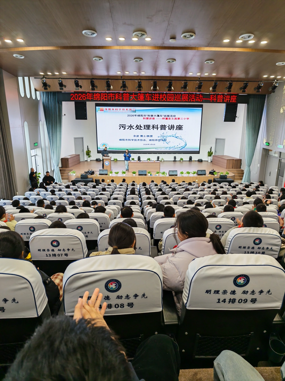 作为本次活动的重头戏,一场别开生面的《污水处理科普讲座》在学校学术厅同步举行。本次讲座特邀绵阳师范学院地理与环境学院教授、环境领域专家余波博士担任主讲嘉宾。通过生动的演示、直观的净水小实验以及深入浅出的讲解,向同学们揭示了日常生活中产生的污水是如何经过复杂而奇妙的处理流程,最终"变身"为清澈达标的水回归自然的。讲座过程中,同学们积极参与水质检测互动实验,亲眼见证了浑浊的污水在过滤、净化后逐渐变得透明,现场惊叹声此起彼伏。这场讲座不仅普及了水环境保护知识,更在孩子们心中种下了节约用水、爱护资源的绿色种子。
