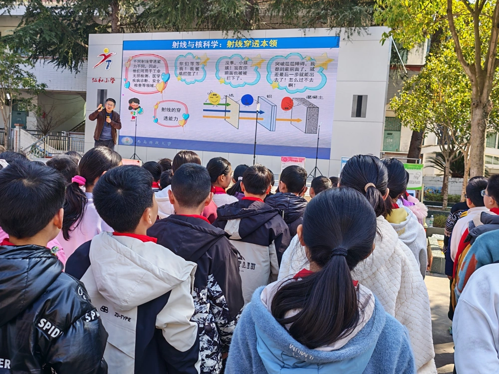 随后,西南科技大学杨玉山教授带来《神秘的核科学》科普讲座。杨教授用生动的比喻和动画视频,将深奥的核裂变原理变得通俗易懂。在提问环节,孩子们争相举手:“核废料怎么处理?”“核电站会爆炸吗?”杨教授一一耐心解答,并鼓励大家努力学习,未来投身科学研究。
