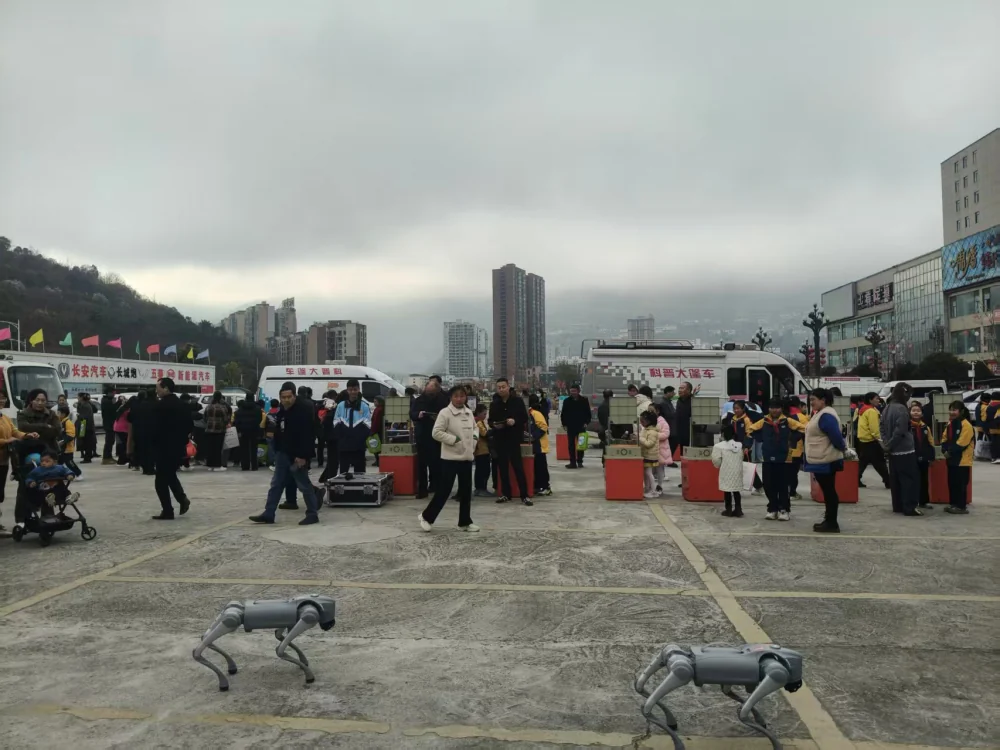 活动当天清晨,广元市科协与旺苍县科协的科普大篷车便已闪亮登场,各类互动展品错落有致,仿佛一座微缩的“流动科技馆”,将现场装点得科幻感十足,瞬间点燃了大家的期待。四足机器人、智能农用无人飞机、水下探测机器人、地震救援机器人纷纷亮相公众视野,一件件“黑科技”设备吸引了大批群众驻足观看、互动体验,不少青少年围着科普大篷车车载科普展品认真操作,在沉浸式体验中解锁科学奥秘,现场氛围热烈有序。