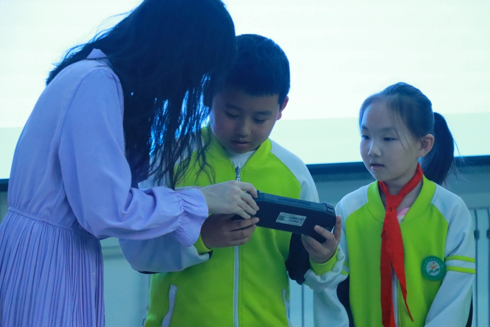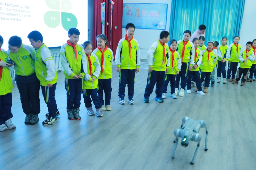在互动环节中,同学们不仅认真聆听讲解,还积极提问,现场气氛热烈。尤其当宇树科技的智能机器狗惊艳亮相时,更是将活动推向了高潮。只见这只灵活的“电子伙伴”在操场上自如地行走、作揖,甚至随着音乐节拍起舞,引得孩子们欢呼雀跃,纷纷围拢过来与它“亲密接触”。在工作人员的指导下,同学们轮流尝试通过平板电脑发出指令,指挥机器狗完成前进、后退、翻滚等动作,直观感受了人工智能与仿生技术的完美结合。