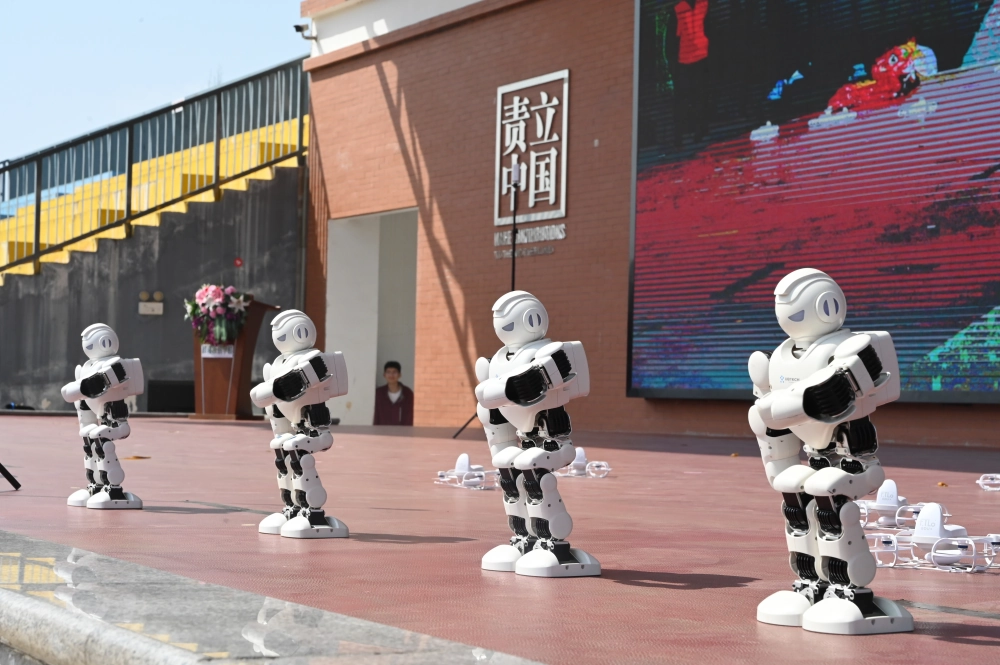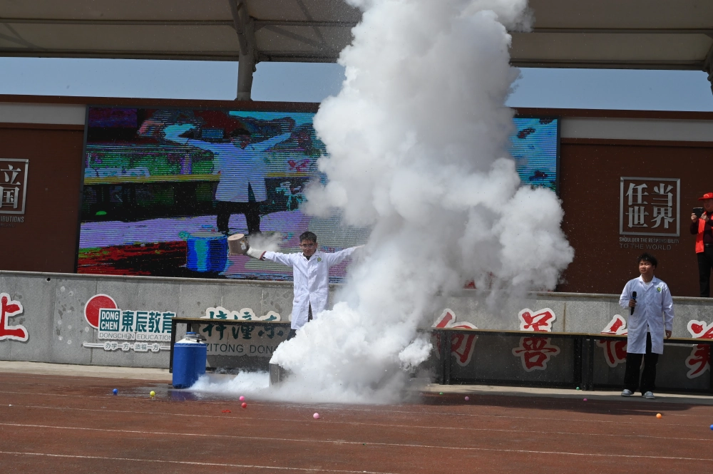 活动现场,15件涵盖光学、力学、电磁学等领域的科普互动展品有序陈列,学生们在动手操作中探索科学原理,不时发出阵阵惊叹。舞台上,无人机编队以精准的队列变换划破长空,10只阿尔法机器人伴随音乐节奏整齐舞动,灵巧的机械狗完成翻滚、跳跃等高难度动作,引得孩子们欢呼连连。科学实验秀环节,科普老师通过“火焰掌”“液氮磨菇云”等趣味实验,将深奥的科学知识转化为直观的视觉冲击,现场掌声与笑声交织成一片。