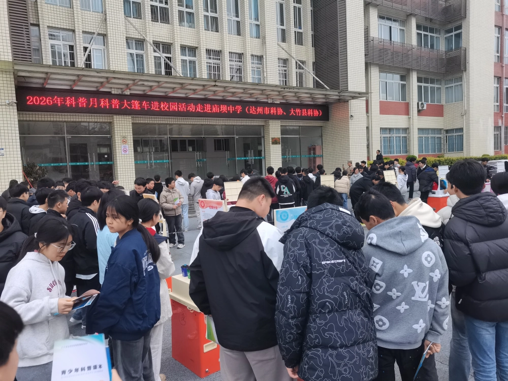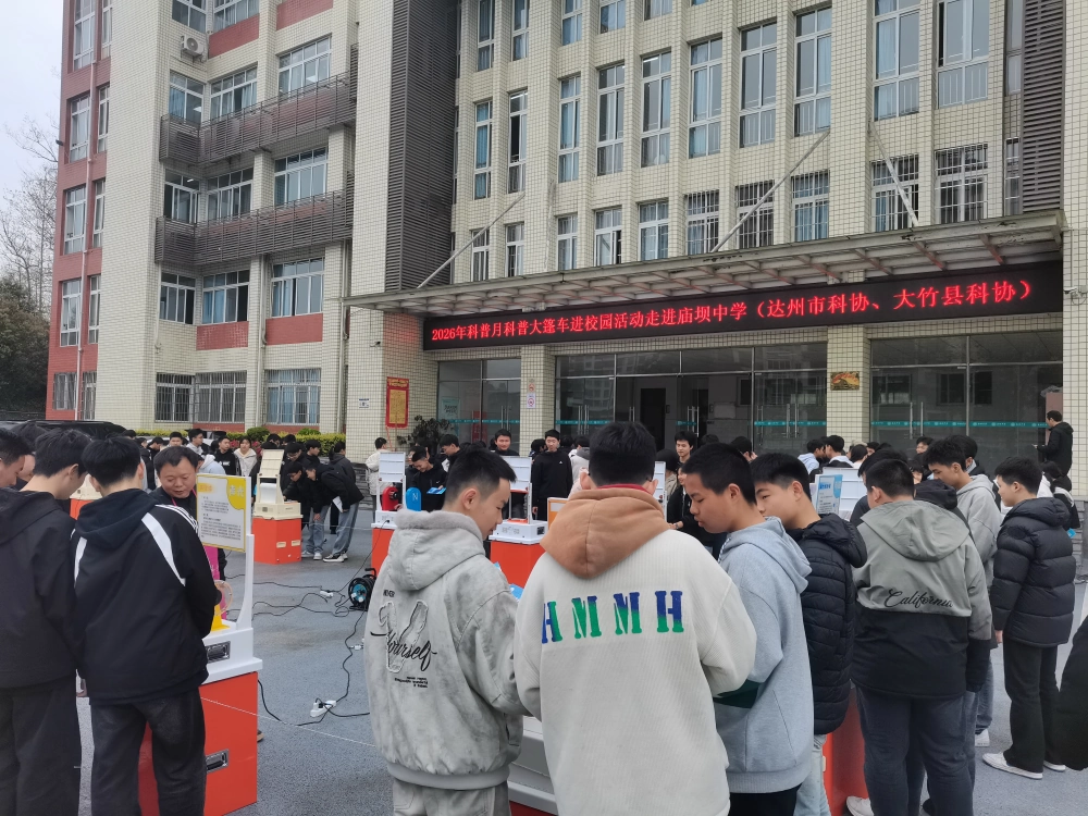 3月19日上午,达州市科协联合大竹县科协携科普大篷车走进大竹县庙坝中学,为学校师生带来了一场生动有趣的科普活动。活动依托流动科普大篷车资源,将力学、光学、电磁学等领域的趣味科普展品搬进校门,让学生们近距离感受科学魅力。