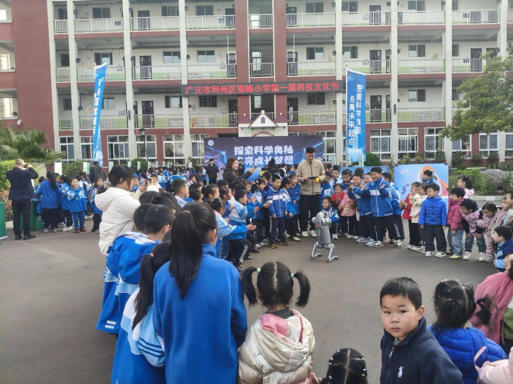 灵动的机器狗成为全场焦点,它在校园里灵活穿梭、旋转跳跃,主动与孩子们互动问好,遇障绕行,引得孩子们一路跟随追跑,欢声笑语不断,精彩卖力的表演点燃全场热情,引来孩子们阵阵掌声与喝彩。