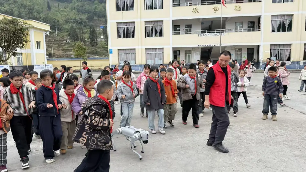 如果说体验区是静心探索的课堂,那么操场中央便是点燃激情的舞台。无人机腾空而起,在空中划出流畅的弧线,引得孩子们仰头欢呼;机器狗憨态可掬地行走、翻滚、作揖,每一个动作都引来阵阵欢笑与掌声。当科技以这样鲜活的方式走到身边,人工智能不再是遥远的概念,而成了触手可及的惊喜。