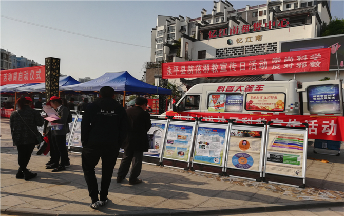 2019年3月26日,永平县科学技术协会与县委组织部,在博南镇忆江南小区联合开展“扫黑除恶—永平党组织在行动”宣传活动暨大篷车科普进社区活动。县级各单位党支部,社区党支部部分党员参加了活动。为进一步发挥基层党组织的政治优势、组织优势、直接联系服务群众的优势,引导和鼓励党员群众全面参与扫黑除恶专项斗争,发动全县党员干部、广大人民群众认真参与开展扫黑除恶宣传工作,掀起全社会扫黑除恶的高潮,鼓励发动群众揭发举报涉黑、涉恶线索,“有黑必扫、有恶必除”让黑恶势力无处遁形,还群众一个朗朗乾坤的社会环境。永平县科协开展了大篷车进社区的科普宣传活动,利用科普大篷车多媒体系统播放了“扫黑除恶”宣传片视频,展出了“崇尚科学反对邪教”的宣传展板,向社区居民发放了环保袋及各类科普书籍、报刊、杂志。倡导大家科学健康生活,爱党爱国,爱岗敬业,树立正确的世界观、价值观。以此来促进社区和谐气氛,提高社区人文环境质量。