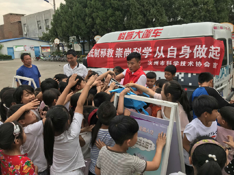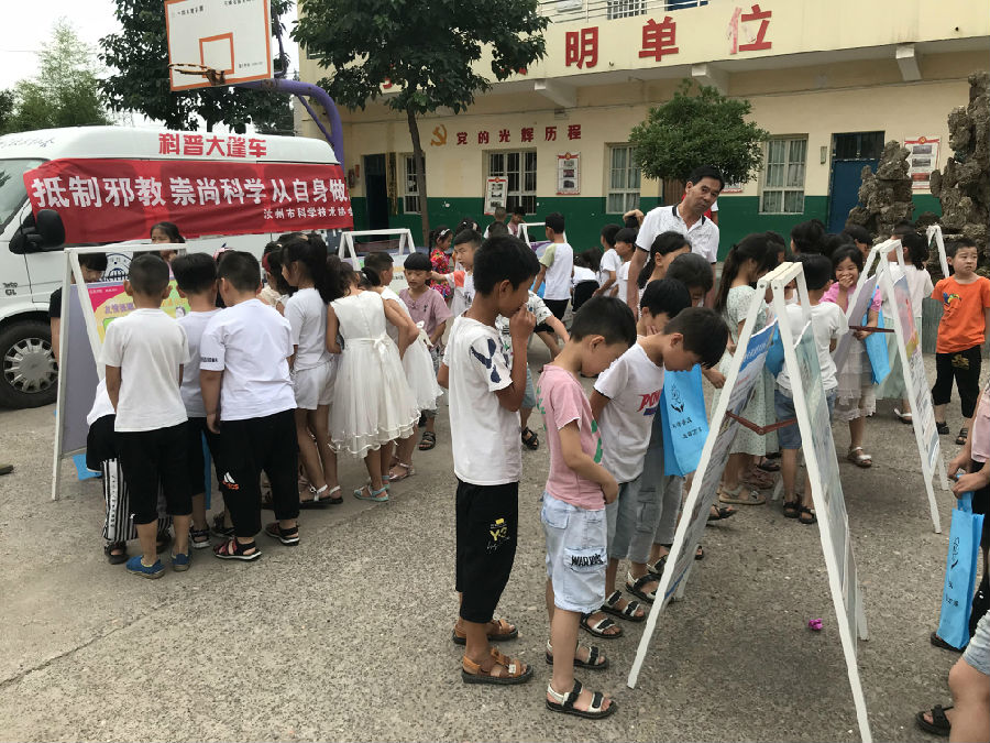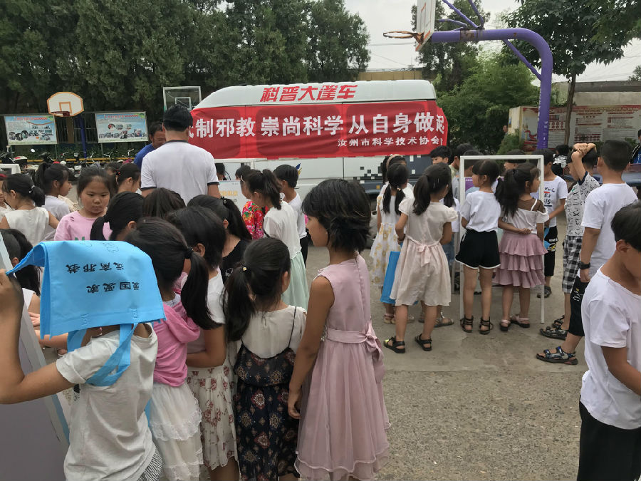 2019年6月24日市科协大篷车走进蟒川小学开展反邪教活动,志愿者通过悬挂横幅、展示反邪教展板、发放宣传资料、宣传手提袋等形式,向学生们宣传邪教的种类、邪教的危害以及如何抵制邪教等知识,使学生们进一步认清了邪教的本质,提高了对邪教组织的抵制能力,还宣传了有关健康生活等方面的科普知识。