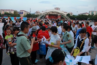 当晚19:00至20:00,市防灾减灾局、市民政局、市科协、市科技局等13家单位联合组织开展的集中式主题宣传活动,主题明确、内容丰富。联合展出以“科学减灾·依法应对”为主题的科普知识展板,开展防灾减灾科普宣传活动,散发防灾减灾知识宣传材料和宣传品,现场为群众讲解防灾减灾知识,广场大型电子屏幕滚动播放防灾减灾知识、地震灾害应对宣传教育片,并为群众提供现场咨询服务。群众参加非常踊跃,现场气氛热烈,3000多群众自发参与其中,玉溪电视台、玉溪大众台实地拍摄报道,玉溪日报记者现场采访。