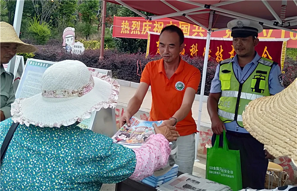 活动现场科技辅导员和交警大队民警认真、耐心的对赶集市的广大群众做科普知识、烤烟种植、水稻栽培技术、病虫害防治、道路交通安全法、机动车驾驶员安全警示教育等方面做详细的讲解宣传;向过往群众发放《全面科学素质300问》《奥秘画报》《防震减灾知识》《中华人民共和国道路交通安全法》等宣传资料;用大篷车车载设备播放《建党百年》《红军长征》等红色经典视频。