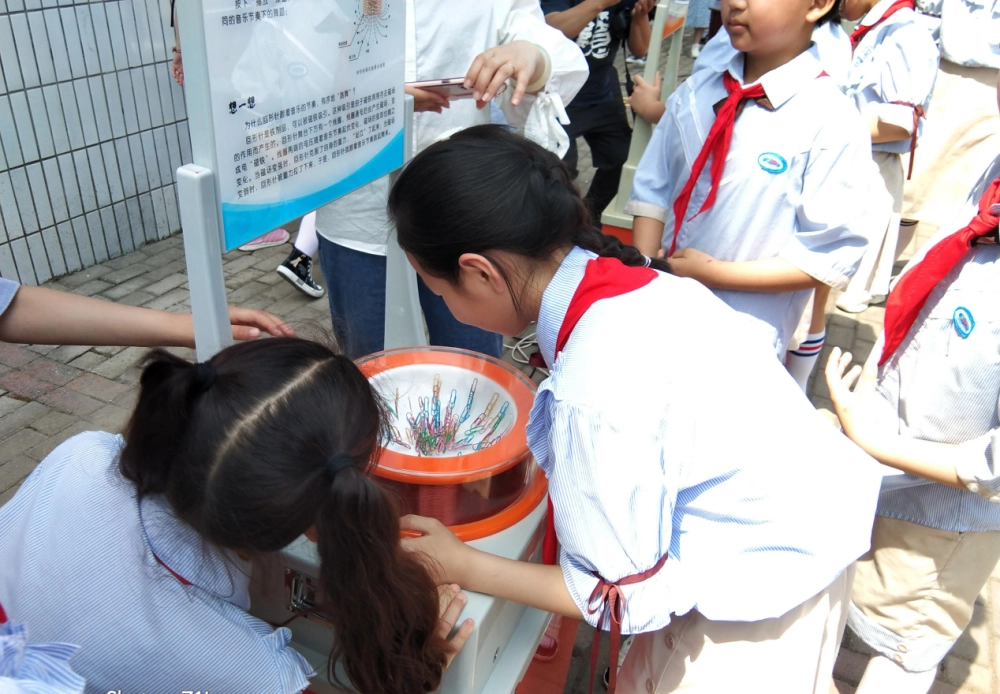 同学们在老师的引导下有序参观,并亲自动手操作体验。跳舞的回形针、温柔的电击、无弦琴等科普互动展品,深受学生们的喜爱。