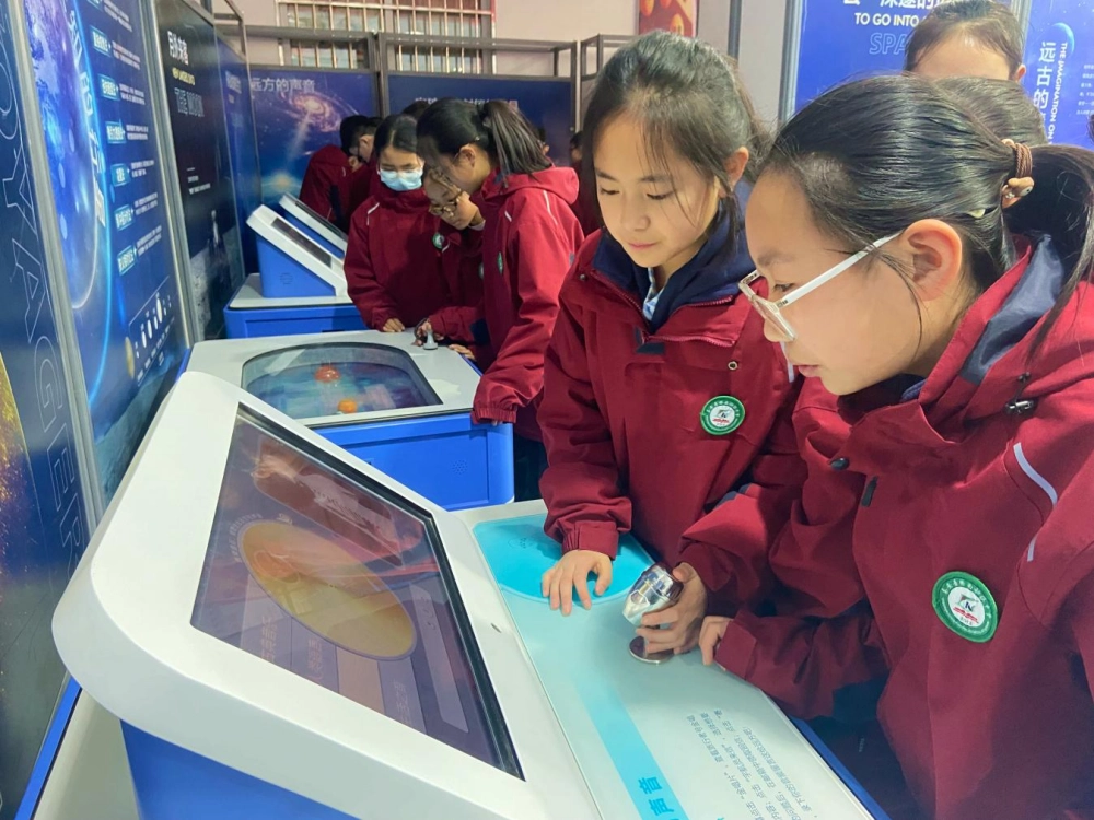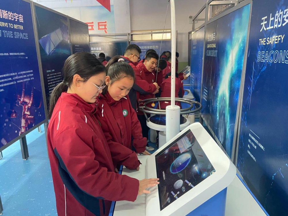 启动仪式结束后,与会领导与师生代表一同走进展区参观体验。本次巡展活动以“科普赋能发展 创新引领未来”为主题设置三个展区,分别是:《去往远方的远方》《炫酷科技·玩美世界》以及《AI,超越人类?》,展览以互动体验为主包含40余件展品,从航天探索起步到科学艺术再到AI在生活中的应用,将科学知识与趣味体验结合引导青少年感受科技的魅力。活动现场大家驻足观看,亲手操作,深入交流,切身感受科学技术的神奇与奥妙。学生们表现出浓厚的兴趣,纷纷表达了青少年对科技世界的好奇与向往,承诺将以此次巡展为契机,积极学习科学知识,培养创新思维,努力成长为具备科学素养的新时代好少年。